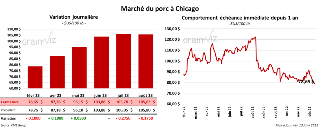 Les contrats de porc US aux échéances les plus rapprochées ont terminé la session en hausse de 5 à 10 cents. Celui février 23 a fait exception en clôturant en recul de 10 cents.