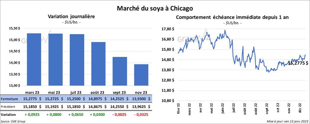 Les contrats de soya US aux échéances les plus rapprochées ont clôturé avec des gains entre 6 ½ et 9 ¼ cents. Ceux de tourteau de soya US aux échéances les plus rapprochées ont fait l’inverse en finissant en baisse entre 3,90 et 5,00 $/tonne. Celui janvier 23 a fait exception en terminant au neutre. Les contrats d’huile de soya US aux échéances les plus rapprochées ont fermé entre le neutre et une baisse de 19 points.