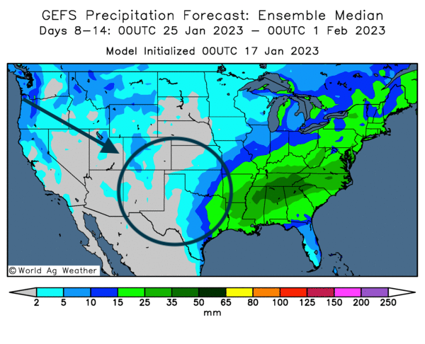 - Cette carte US dessinée pour les 8 à 14 prochains jours montre le manque de précipitations dans le sud-ouest des régions de production de blé dur rouge d’hiver US.