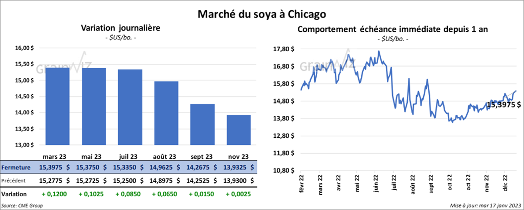 Les contrats de soya US aux échéances les plus rapprochées ont clôturé avec des gains entre 8 ½ et 12 cents. Ceux de tourteau de soya US aux échéances les plus rapprochées ont également terminé dans le vert entre 3,60 et 4,90 $/tonne. Les contrats d’huile de soya US aux échéances les plus rapprochées ont fermé en progression entre 60 et 78 points.