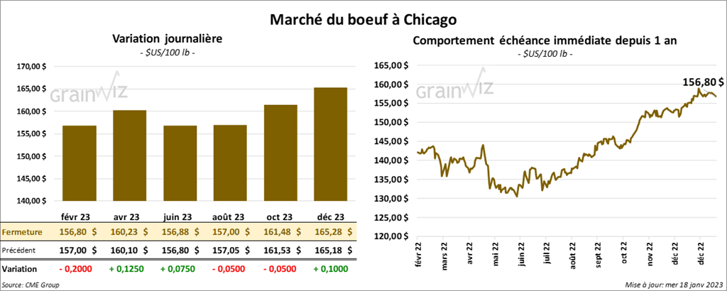 Les contrats de bœuf US aux échéances les plus rapprochées ont terminé la séance en hausse entre 7 et 12 cents. Celui février 23 a fait exception en fermant en baisse de 20 cents. Les contrats de veau US aux échéances les plus rapprochées ont fini en progression de 42 cents. Celui janvier 23 a fait exception en terminant en recul de 15 cents.