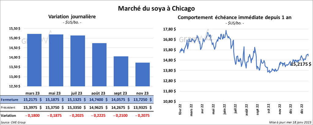 Les contrats de soya US aux échéances les plus rapprochées ont clôturé en recul entre 18 et 20 ¼ cents. Ceux de tourteau de soya US aux échéances les plus rapprochées ont également fini dans le rouge entre 3,10 et 8,40 $/tonne. Les contrats d’huile de soya US aux échéances les plus rapprochées ont terminé la journée en hausse entre 25 et 28 points.