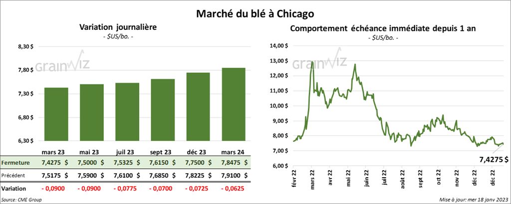 À Chicago, les contrats de blé aux échéances les plus rapprochées ont fermé avec des pertes entre 7 ¾ et 9 cents. À Kansas, ceux de blé dur rouge aux échéances les plus rapprochées ont terminé en baisse entre 11 et 14 ¼ cents. À Minneapolis, les contrats de blé de printemps US ont fini avec des pertes entre 15 ¼ et 16 ¼ cents.