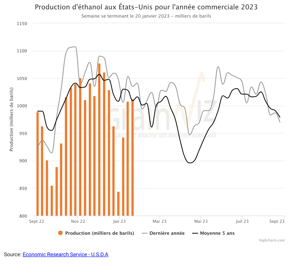 Au cours de la semaine du 20 janvier dernier, la production moyenne d’éthanol US a été de 1,012 million de barils par jour, ce qui était une augmentation de 0,4 % par rapport à la semaine précédente et une baisse de 2,2 % comparativement à l’an passé. La moyenne des 5 dernières années était de 1,024 million de bpj. Au total, 7,084 millions de barils ont été produits durant la semaine. 101,7 millions de boisseaux de maïs ont été utilisés dans la fabrication de l’éthanol US.
