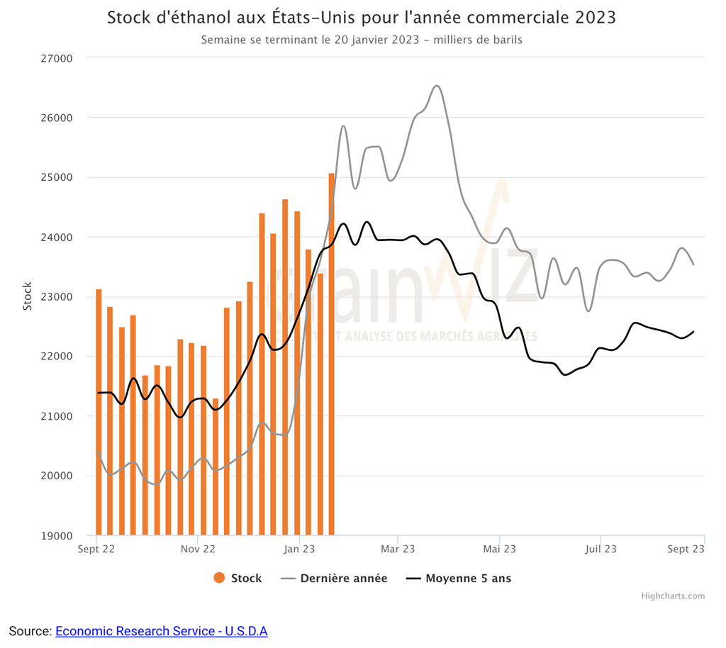 Quant aux inventaires d’éthanol US, ils ont été établis à 25,077 millions de barils, soit à une hausse de 7,2 % comparativement à la semaine précédente et à une augmentation de 2,5 % par rapport à l’an passé. Il s’agit d’un sommet pour 2023. La moyenne des 5 dernières années est de 23,887 millions de barils.