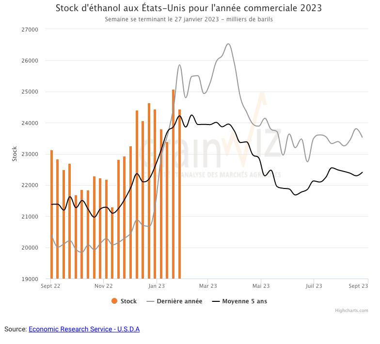 Durant la semaine du 27 janvier dernier, la production moyenne d’éthanol US a été de 1,028 million de baril par jour, soit à une augmentation de 1,6 % comparativement à la semaine précédente et à une baisse de 1,2 % par rapport à l’an dernier. Les attentes des analystes étaient moins élevées. La moyenne des 5 dernières années était de 1,011 million de bpj. Au total, 7,196 millions de barils d’éthanol US ont été produits au cours de la semaine. 103,3 millions de boisseaux de maïs ont été utilisés dans la fabrication de l’éthanol US.