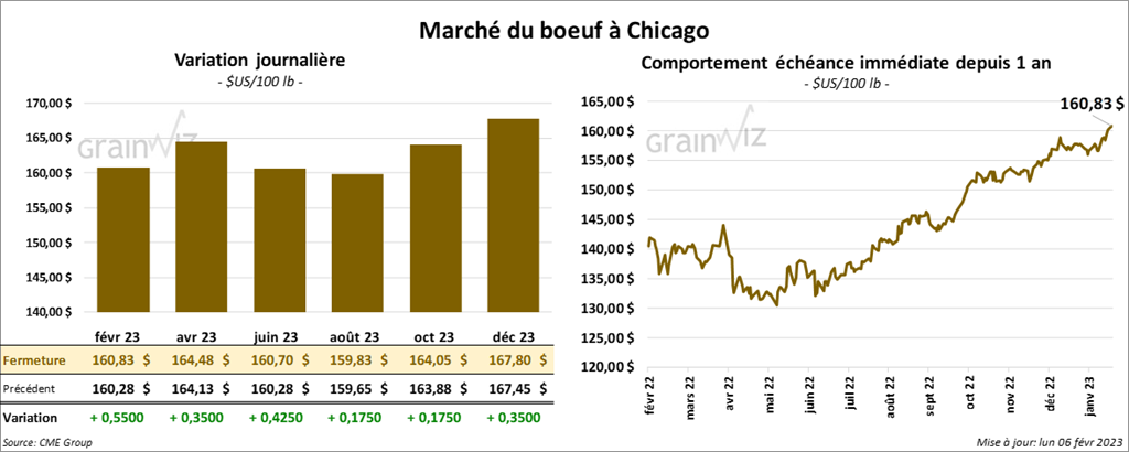 Les contrats de bœuf US aux échéances les plus rapprochées ont fermé avec des gains entre 35 et 55 cents. Ceux de veau US aux échéances les plus rapprochées ont terminé en progression entre 75 cents et 1,60 $.