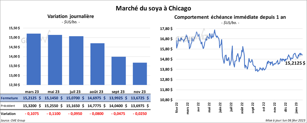 Les contrats de soya US aux échéances les plus rapprochées ont clôturé en baisse entre 9 ½ et 11 cents. Ceux de tourteau de soya US aux échéances les plus rapprochées ont fini en recul entre 3,80 et 7,50 $/tonne. Les contrats d’huile de soya US aux échéances les plus rapprochées ont fait l’inverse en fermant en hausse entre 12 et 25 cents.