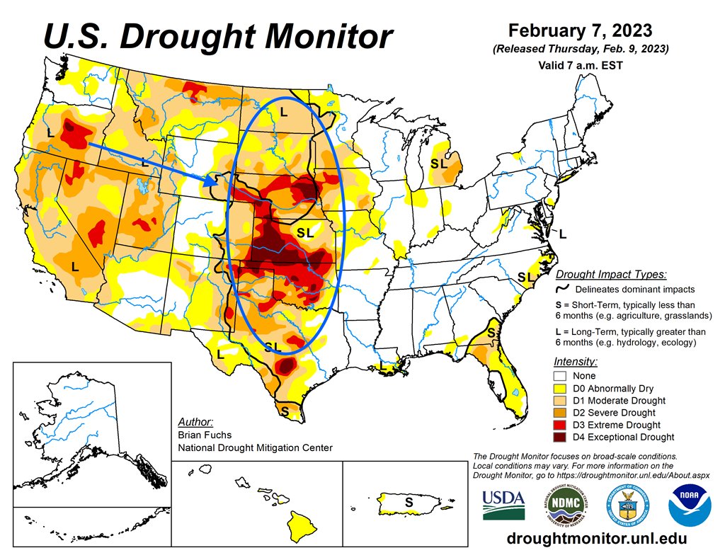 - Les données météo indiquent qu’au 7 février dernier, 60 % des plants de blé d’hiver US se trouvaient dans les régions touchées par la sécheresse. Mais bien que les conditions sèches soient en baisse par rapport à la semaine passée, l’USDA estime qu’actuellement, 58 % du blé d’hiver US se trouvent dans des zones arides.