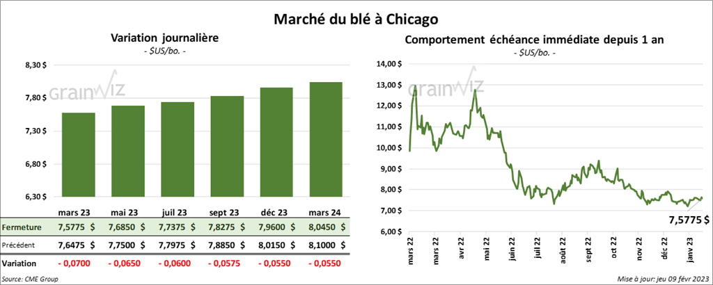 À Chicago, les contrats de blé aux échéances les plus rapprochées ont clôturé en baisse entre 6 et 7 cents. À Kansas, ceux de blé dur rouge aux échéances les plus rapprochées ont également terminé la journée avec des pertes entre 14 ¼ et 17 cents. À Minneapolis, les contrats de blé de printemps aux échéances les plus rapprochées ont fini dans le rouge entre 9 ¼ et 10 ½ cents.