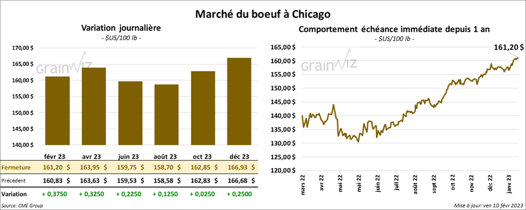 - Le 9 février dernier, le CME Feeder Cattle Index était en hausse de 56 cents à 183,09 $.