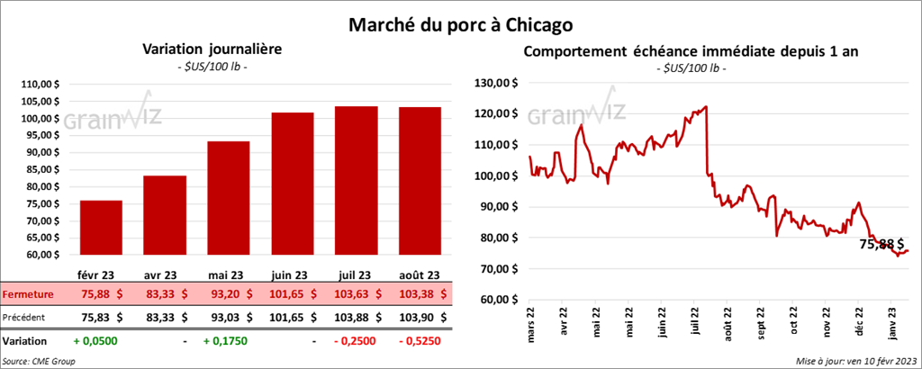 - Le 8 février dernier, le CME Lean Hog Index était en hausse de 5 cents à 73,80 $.