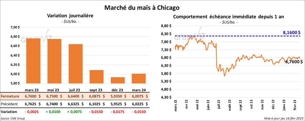 Les contrats de maïs US aux échéances les plus rapprochées ont terminé la journée en hausse entre ¾ et 1 cent. Celui mars 23 a fait exception en clôturant dans le rouge de ¼ cent.
