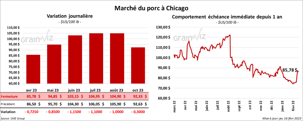 - Le 14 février dernier, le CME Lean Hog Index était en hausse de 44 cents à 75,62 $.