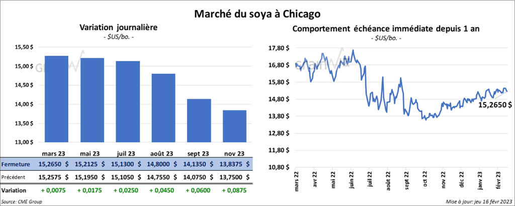 Les contrats de soya US aux échéances les plus rapprochées ont fermé en progression entre ¾ et 2 ½ cents. Ceux de tourteau de soya US a aux échéances les plus rapprochées ont également terminé dans le vert de 30 cents/tonne. Celui juillet 23 a fait exception en finissant en recul de 20 cents. Les contrats d’huile de soya US aux échéances les plus rapprochées ont clôturé avec des gains entre 66 et 71 points.