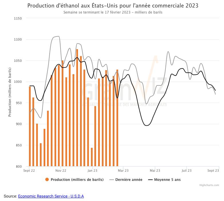 Durant la semaine du 17 février dernier, la production moyenne d’éthanol US a été de 1,029 million de barils par jour, ce qui était une hausse de 1,5 % comparativement à la semaine précédente et une augmentation de 0,5 % par rapport à l’an passé. Le résultat était même supérieur aux attentes des analystes. 103,4 millions de boisseaux de maïs ont été utilisés dans la fabrication de l’éthanol US. Au total, 7,203 millions de barils d’éthanol US ont été produits au cours de la semaine.