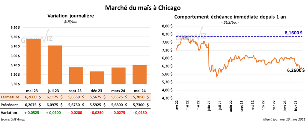 Les contrats de maïs US aux échéances les plus rapprochées ont clôturé avec des gains entre 2 et 5 ¼ cents. Celui septembre 23 a fait exception en terminant en baisse de 2 cents.