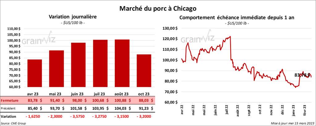 Les contrats de porc US aux échéances les plus rapprochées ont fermé en recul entre 1,62 et 3,57 $.