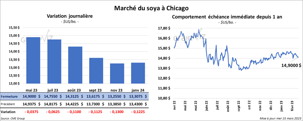 Les contrats de soya US aux échéances les plus rapprochées ont fini la séance dans le rouge entre 3 ¾ et 11 cents. Ceux de tourteau de soya US aux échéances les plus rapprochées ont également fermé en recul entre 2,40 et 4,70 $/tonne. Les contrats d’huile de soya US aux échéances les plus rapprochées ont fait l’inverse en terminant en hausse entre 22 et 32 points.