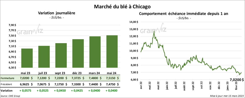 À Chicago, les contrats de blé aux échéances les plus rapprochées ont clôturé en progression entre 4 ½ et 5 ¾ cents. À Kansas, ceux de blé dur rouge aux échéances les plus rapprochées ont également fini dans le vert entre ¾ et 2 ½ cents. À Minneapolis, les contrats de blé de printemps aux échéances les plus rapprochées ont terminé avec des gains entre 2 ½ et 6 cents.