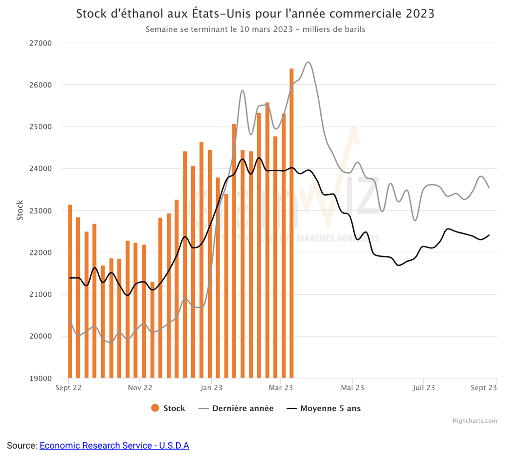 Durant la semaine du 10 mars dernier, la production moyenne d’éthanol US a été de 1,014 million de barils par jour, ce qui était dans la fourchette inférieure des attentes des analystes. Il s’agissait par contre d’une augmentation de 0,4 % par rapport à la semaine précédente et d’une baisse de 1,2 % comparativement à l’an dernier, à la même période. Au total, 7,098 millions de barils d’éthanol US ont été produits au cours de la semaine. 101,92 millions de boisseaux de maïs ont été utilisés dans la fabrication de l’éthanol US.