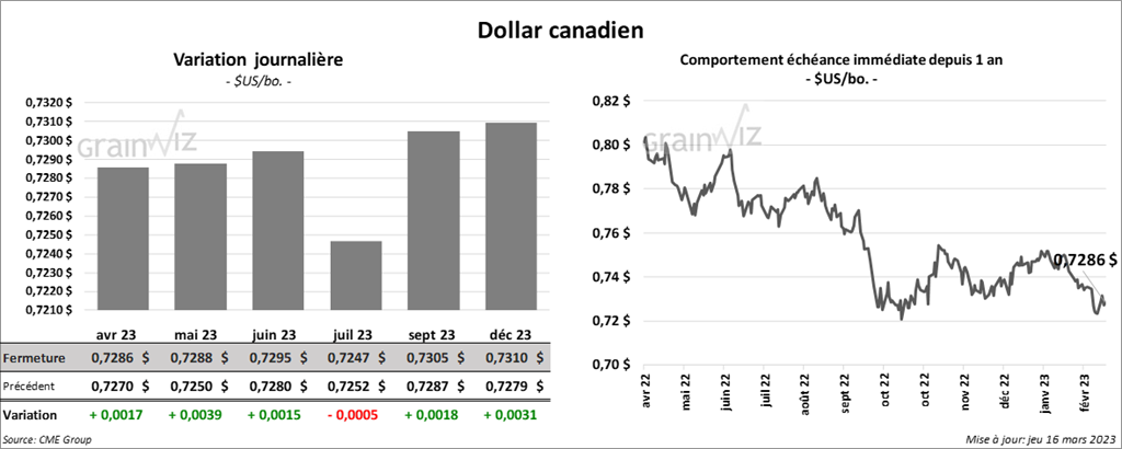 - Durant la semaine du 9 mars dernier, les ventes à l’exportation de maïs US 2022/23 ont été de 1,236,200 tonnes, ce qui était une baisse de 13 % comparativement à la semaine précédente et une hausse de 28 % par rapport à la moyenne des 4 dernières semaines. Le Japon et la Colombie ont été les principaux acheteurs. Les projections des analystes étaient entre 750,000 et 1,5 million de tonnes. Dans le cas de 2023/24, les ventes à l’exportation ont été de 183,500 tonnes. Le Japon et le Mexique ont été les acheteurs. Les anticipations des analystes étaient entre 0 et 200,000 tonnes.