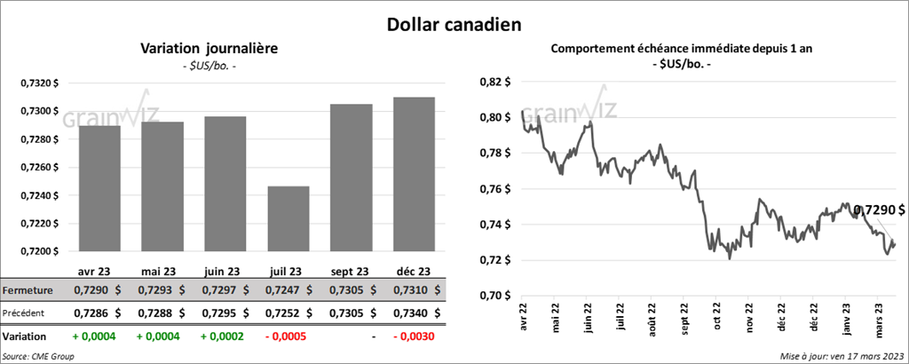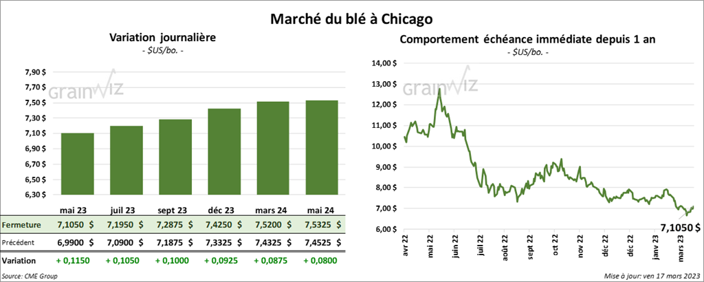 - À l’instar de la Turquie et de l’Ukraine, l’ONU souhaite une prolongation de l’accord sur les exportations de grain ukrainien à partir de la mer Noire à 120 jours. Les Russes, quant à eux, persistent à vouloir mettre en place une extension de 60 jours. Toutefois, les négociations sont toujours en cours, même si la date butoir du 18 mars approche très rapidement. L’obstination des Russes dans les discussions donne un support aux prix du grain, spécialement à ceux du maïs et du blé.