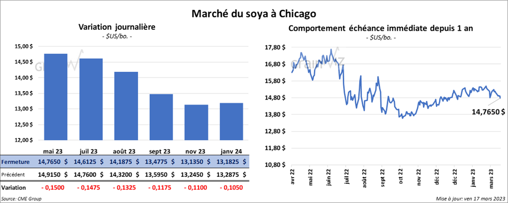 Les contrats de soya US aux échéances les plus rapprochées ont clôturé en baisse entre 13 ¼ et 15 cents. Ceux de tourteau de soya US aux échéances les plus rapprochées ont également terminé avec des pertes entre 5,50 et 8,00 $/tonne. Les contrats d’huile de soya US aux échéances les plus rapprochées ont fini dans le rouge de 27 points.