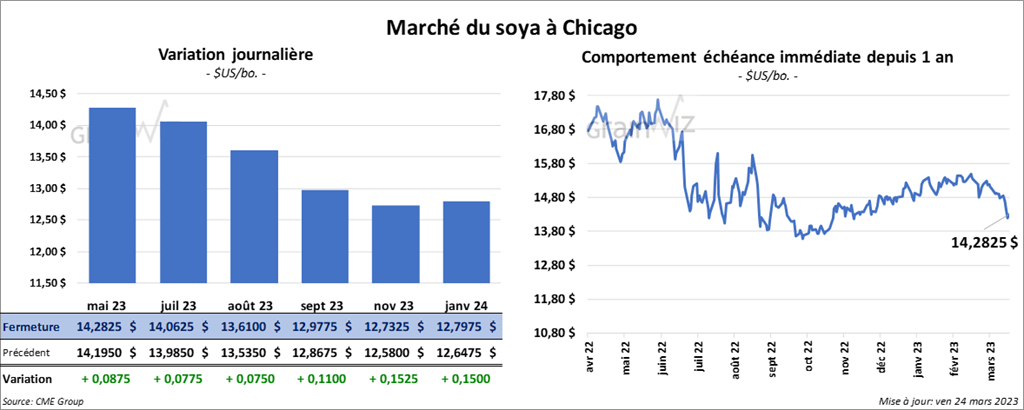 Les contrats de soya US aux échéances les plus rapprochées ont clôturé en hausse entre 7 ½ et 8 ¾ cents. Ceux de tourteau de soya US aux échéances les plus rapprochées ont également fini dans le vert entre 6,80 et 7,20 $/tonne. Les contrats d’huile de soya US aux échéances les plus rapprochées ont terminé en progression entre 101 et 110 points.