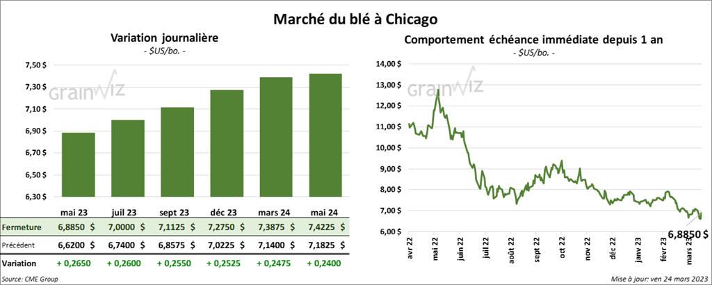 À Chicago, les contrats de blé aux échéances les plus rapprochées ont fini la session en hausse entre 25 ½ et 26 ½ cents. À Kansas, ceux de blé dur rouge ont aussi terminé la journée dans le vert entre 26 ¾ et 28 ¼ cents. À Minneapolis, les contrats de blé de printemps aux échéances les plus rapprochées ont clôturé avec des gains entre 16 ¼ et 19 cents.