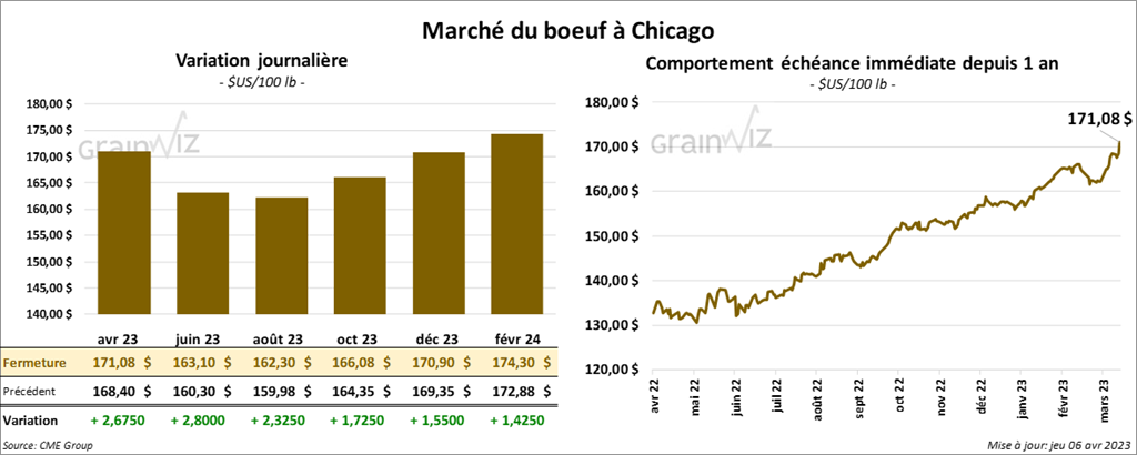 Les contrats de bœuf US aux échéances les plus rapprochées ont terminé la session en hausse entre 2,67 et 2,80 $. Ceux de veau US aux échéances les plus rapprochées ont également fini dans le vert entre 2,80 et 3,37 $.