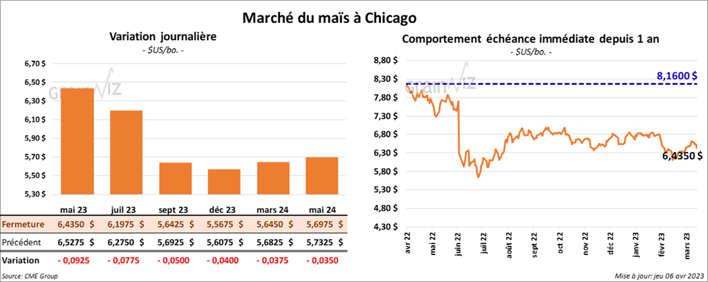 - Durant la semaine du 30 mars dernier, les ventes à l’exportation de maïs US 2022/23 ont été de 1,246,600 tonnes, ce qui était une augmentation de 20 % par rapport à la semaine précédente et une baisse de 26 % comparativement à la moyenne des 4 dernières semaines. La Chine et les destinations inconnues ont été les principales acheteuses. Pour 2023/24, les ventes à l’exportation ont été de 26,200 tonnes. Le Japon a été l’acheteur. Les attentes des analystes étaient entre 800,000 et 1,8 million de tonnes.