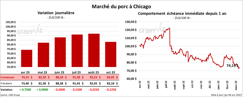 Les contrats de porc US aux échéances les plus rapprochées ont clôturé avec des gains entre 75 et 90 cents. Celui juin 23 a fait exception en terminant en recul par 20 cents.