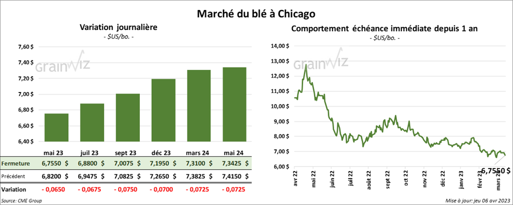 À Chicago, les contrats de blé aux échéances les plus rapprochées ont clôturé avec des pertes entre 6 ½ et 7 ½ cents. À Kansas, ceux de blé dur rouge aux échéances les plus rapprochées ont fait l’inverse en terminant dans le vert entre 2 ¼ et 3 cents. À Minneapolis, les contrats de blé de printemps aux échéances les plus rapprochées ont fini dans le rouge entre 1 ½ et 2 ¾ cents.