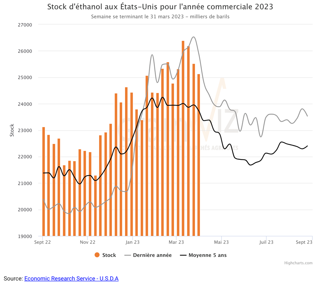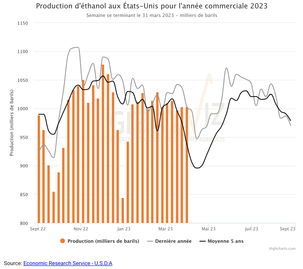Durant la semaine du 31 mars dernier, la production moyenne d’éthanol US a été de 1,003 million de barils par jour, ce qui était inchangé par rapport à la semaine précédente et inchangé comparativement à l’an dernier. Pour la semaine complète, 7,021 millions de barils ont été produits. 100,8 millions de boisseaux de maïs ont été utilisés dans la fabrication de l’éthanol US.