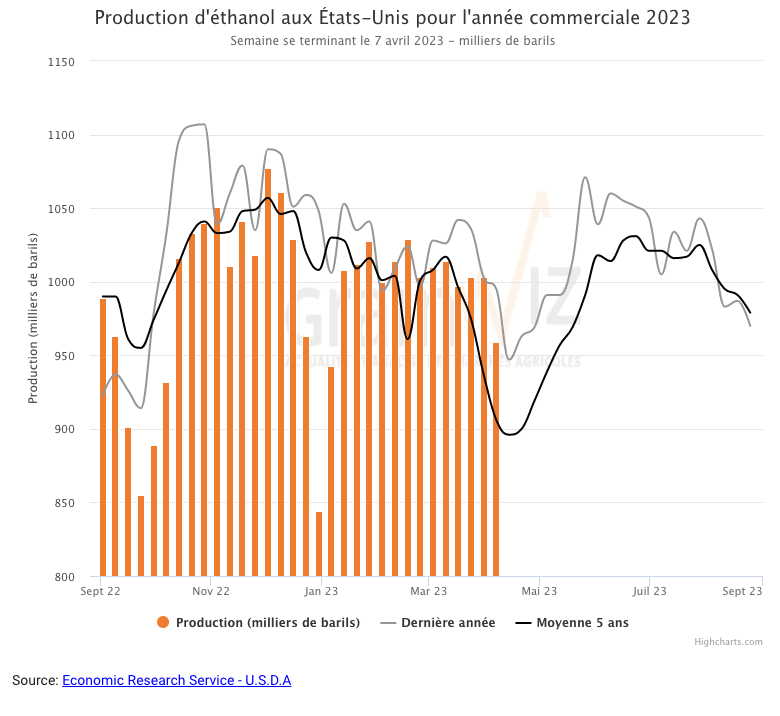 Au cours de la semaine du 7 avril dernier, la production moyenne d’éthanol US a été de 959,000 barils par jour, ce qui était inférieur aux attentes des analystes. Il s’agissait en fait d’une baisse de 4,4 % par rapport à la semaine précédente et d’une réduction de 3,6 % comparativement à l’an passé. Au total, 6,713 millions de barils d’éthanol US ont été produits au cours de la semaine. 96,36 millions de boisseaux de maïs ont été utilisés dans la fabrication de l’éthanol US.