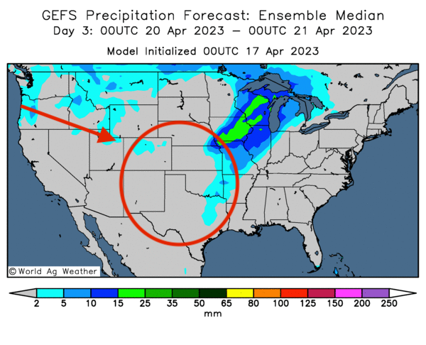 - Cette carte US, dessinée pour les 3 prochains jours, indique une absence de pluie dans le centre et le sud des Plaines US.