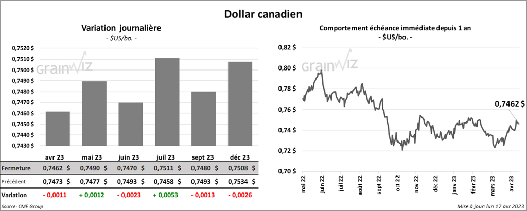 - Durant la semaine du 13 avril dernier, les inspections à l’exportation de maïs US ont été de 1,215,221 tonnes, soit à une augmentation de 44,8 % comparativement à la semaine précédente et à une hausse de 2,7 % par rapport à l’an dernier. Les prévisions des analystes étaient entre 700,000 et 1,05 million de tonnes. Quant au cumulatif annuel des inspections à l’exportation de maïs US, il a été inférieur à celui de l’an passé par 35,6 % à 21,423,929 tonnes.