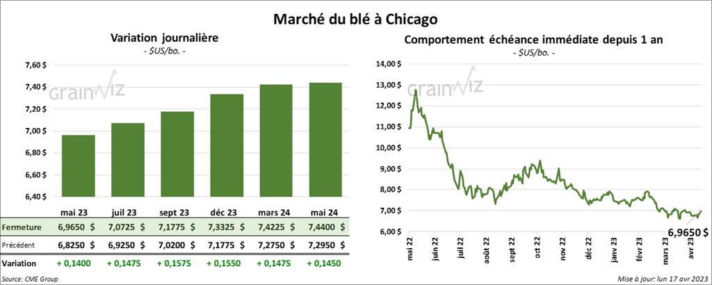À Chicago, les contrats de blé aux échéances les plus rapprochées ont fini la journée en progression entre 14 et 15 ¾ cents. À Kansas, ceux de blé dur rouge aux échéances les plus rapprochées ont également clôturé dans le vert entre 11 et 13 cents. À Minneapolis, les contrats de blé de printemps aux échéances les plus rapprochées ont fermé avec des gains entre 12 ¾ et 15 ¼ cents.