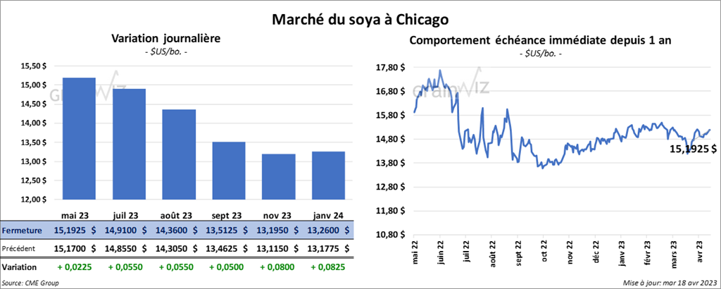 Les contrats de soya US aux échéances les plus rapprochées ont fermé en baisse entre 2 ¼ et 5 ½ cents. Ceux de tourteau de soya US aux échéances les plus rapprochées ont également clôturé en recul entre 3,10 et 4,60 $/tonne. Les contrats d’huile de soya US aux échéances les plus rapprochées ont fait l’inverse en finissant dans le vert entre 79 et 83 points.