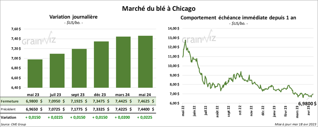 À Chicago, les contrats de blé aux échéances les plus rapprochées ont fini la séance en progression entre 1 ½ et 2 ¼ cents. À Kansas, ceux de blé dur rouge aux échéances les plus rapprochées ont fait l’inverse en terminant dans le rouge entre 8 et 8 ½ cents. À Minneapolis, les contrats de blé de printemps aux échéances les plus rapprochées ont également fermé avec des pertes entre 2 ¾ et 3 ½ cents.
