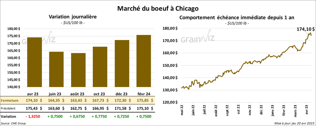 Les contrats de bœuf US aux échéances les plus rapprochées ont clôturé avec des gains entre 67 et 75 cents. Celui avril 23 a fait exception en terminant dans le rouge par 1,32 $. Les contrats de veau US aux échéances les plus rapprochées ont également fini dans le vert entre 35 cents et 2,75 $.