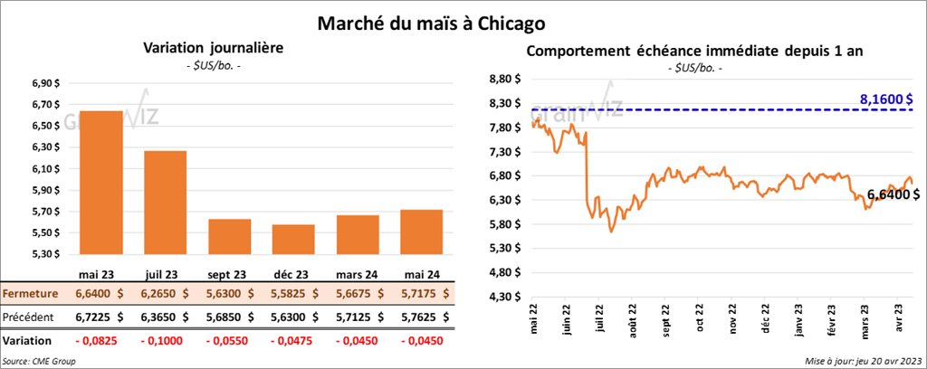 - Durant la semaine du 13 avril dernier, les ventes à l’exportation de maïs US 2022/23 ont été de 312,400 tonnes, soit à une baisse de 41 % comparativement à la semaine précédente et à une réduction de 79 % par rapport à la moyenne des 4 dernières semaines. La Chine et l’Arabie Saoudite ont été les principales acheteuses. Les attentes des analystes étaient entre 575,000 et 850,000 tonnes. Pour 2023/24, les ventes à l’exportation ont été de 422,000 tonnes. La Chine et le Mexique ont été les plus gros acheteurs. Les projections des analystes étaient entre 135,000 et 400,000 tonnes.