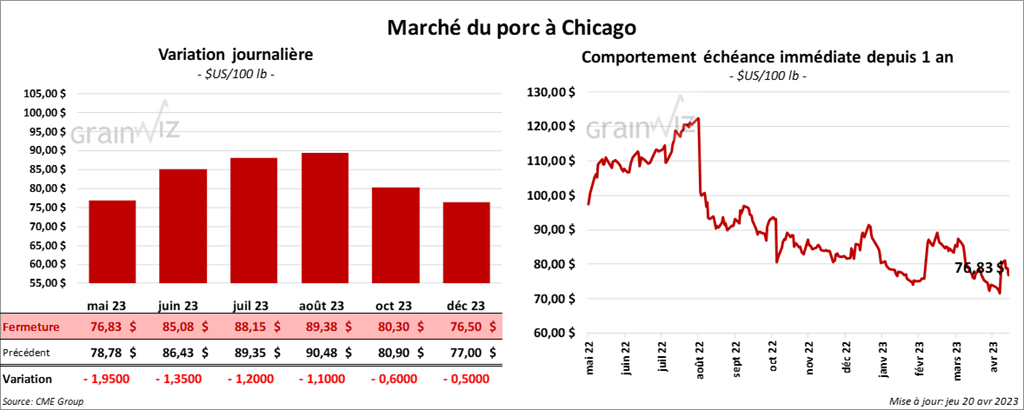 - Le 18 avril dernier, le CME Lean Hog Index était en baisse de 7 cents à 71,57 $.
