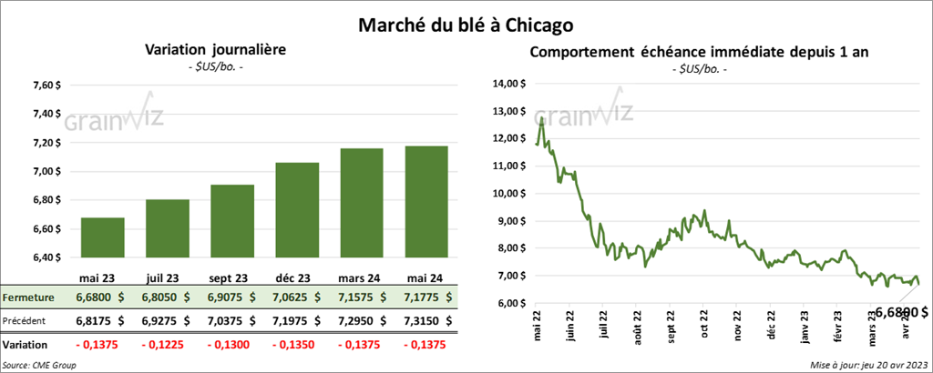 À Chicago, les contrats de blé aux échéances les plus rapprochées ont fermé en baisse entre 12 ¼ et 13 ¾ cents. À Kansas, ceux de blé dur rouge aux échéances les plus rapprochées ont également terminé avec des pertes entre 21 ½ et 23 cents. À Minneapolis, les contrats de blé de printemps aux échéances les plus rapprochées ont fini en recul entre 11 ¼ et 11 ½ cents.