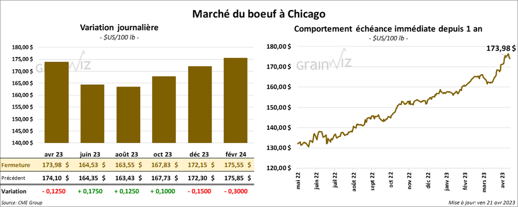 Les contrats de bœuf US aux échéances les plus rapprochées ont clôturé en hausse entre 12 et 17 cents. Celui avril 23 a fait exception en terminant en baisse de 12 cents. Les contrats de bœuf US aux échéances les plus rapprochées ont fini la journée en progression entre 5 et 35 cents. Celui avril 23 a fait exception en fermant avec une perte de 1,25 $.