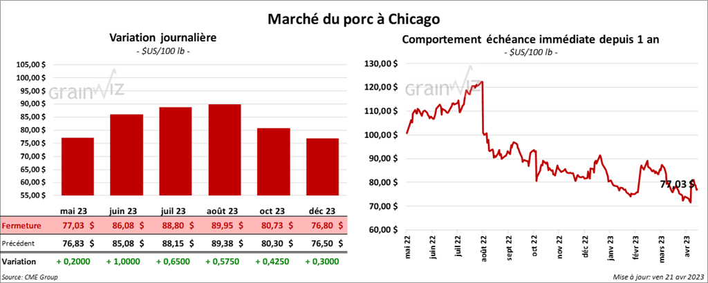 - Le 19 avril dernier, le CME Lean Hog Index était en baisse de 16 cents à 71,41 $.