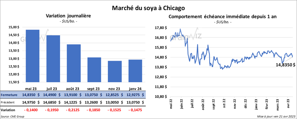 Les contrats de soya US aux échéances les plus rapprochées ont fermé avec des pertes entre 14 et 21 ¼ cents. Ceux de tourteau de soya US aux échéances les plus rapprochées ont également terminé dans le rouge entre 3,90 et 5,60 $/tonne. Les contrats d’huile de soya US aux échéances les plus rapprochées ont fini en recul entre 103 et 104 points.
