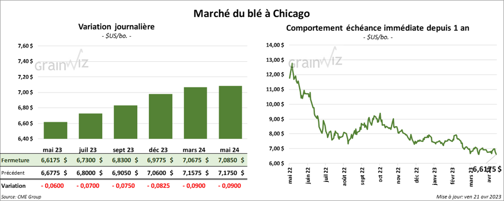 À Chicago, les contrats de blé aux échéances les plus rapprochées ont terminé la session en baisse entre 6 et 7 ½ cents. À Kansas, ceux de blé dur rouge ont également fermé avec des pertes entre 1 ¼ et 2 ¼ cents. Celui mai 23 a fait exception en clôturant en progression de ½ cent. À Minneapolis, les contrats de blé de printemps aux échéances les plus rapprochées ont fini dans le rouge entre 8 ¾ et 9 ½ cents.