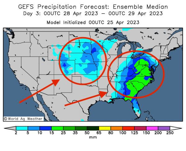 - World Weather soutient que des systèmes d’averses sont actuellement en formation aux alentours du centre et du sud des Plaines US. L’organisme croit également que ces précipitations pourraient, à terme, apporter un certain soulagement aux cultures de blé d’hiver de ces régions déjà fortement affectées par la sécheresse des derniers mois. World Weather précise que ces systèmes pourraient même poursuivre leur évolution au cours du mois de mai.